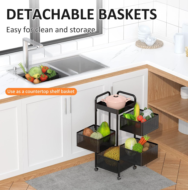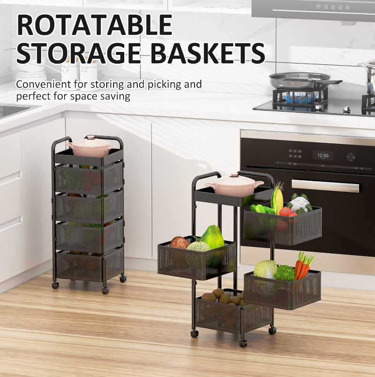 • Removable and breathable fruit baskets: Each basket can be removed and used separately. If you want to clean the rotating basket, you can remove the baskets individually. The encrypted metal mesh design increases air circulation and keeps your potatoes, vegetables, and fruits fresh.