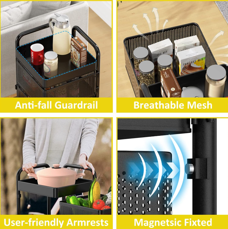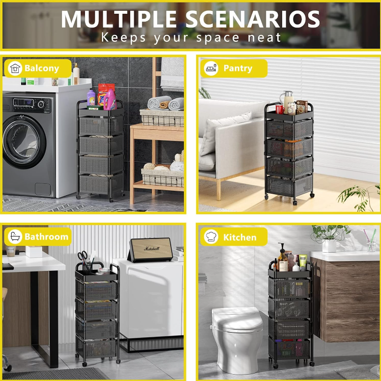 • Multifunctional storage trolley: fruit and vegetables, the trolley can also organize toys, books, snacks, drinks, clothes, plates, or other small items for your kitchen, living room, bedroom, bathroom, office, etc. Keeps your space organized and tidy.