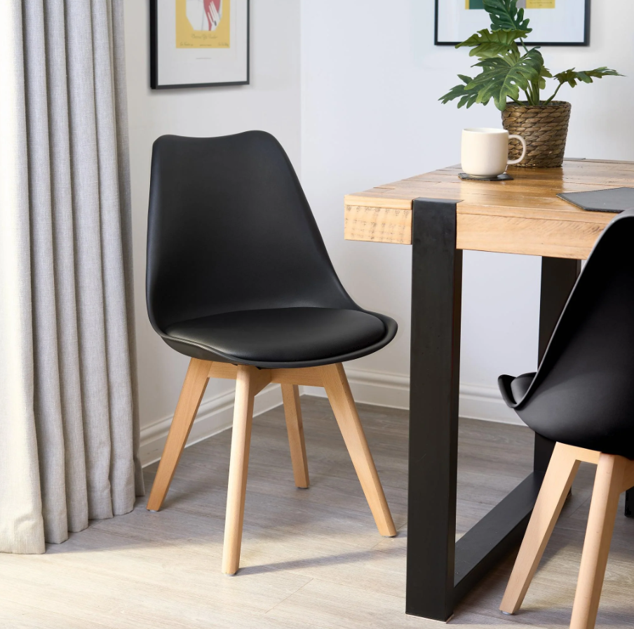 Adorn your dining room with the stylish and modern Rocco Dining Chairs. This set of 4 Tulip style chairs provides comfortable seating and a chic look that will elevate your dining experience. An exciting combination of wooden legs and a contemporary Black finish offer effortless elegance in a timeless design!