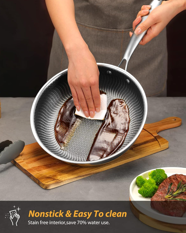 • 【Comfortable Handle】The handle is ergonomic and easy to hold and won't burn your hands while cooking. Hollow stainless steel handle minimizes heat buildup and protects hands from burns. With just the right amount of weight, you can hold the pan with one hand, and it is stable even when used on the stove and won't tip over.