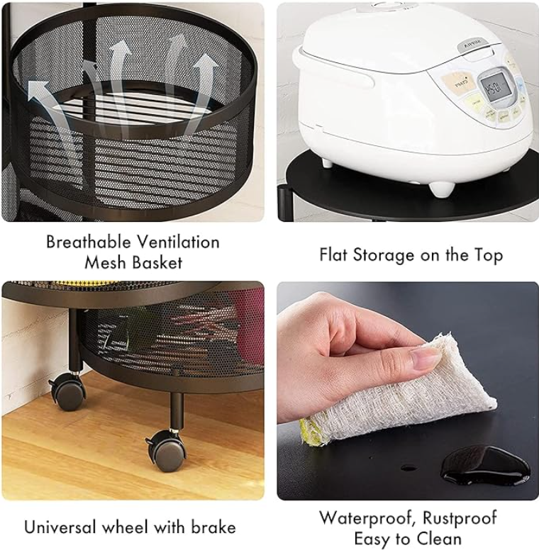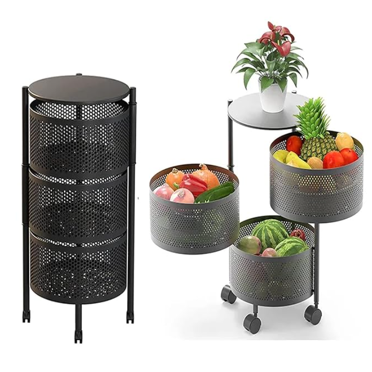 - MULTI-FUNCTIONAL ROTATABLE 3-LAYER STORAGE SHELF - Rotating storage rack is not only suitable for the kitchen to place fruits, vegetables, etc.. It can also be placed in the bathroom for shower, toiletries or as a dirty clothes basket, or in the living room for cluttered items.