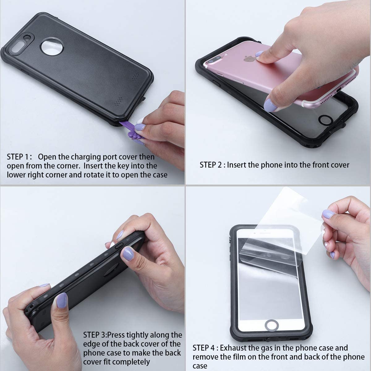 - 【IP68 waterproof case for iPhone 7 Plus/ 8 Plus】 : Every case pass 6.6ft (ca. 2 m) waterproof half an hour. Full sealed cover iPhone 7 Plus/ 8 Plus refuse the damage to dust, snow, sand and dirt. Suitable for all harsh environments, providing perfect protection. The full body sealed design allow taking photos or videos underwater.