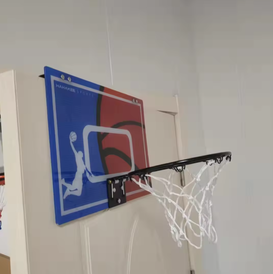 The basketball hoop set features a heavy-duty steel rim, a shatterproof backboard and a strong ball net. The backboard has thick shockproof sponge strips to reduce noise and scratches on the door.