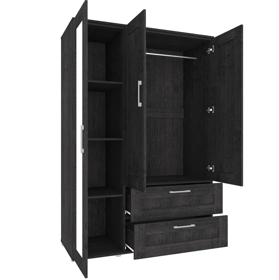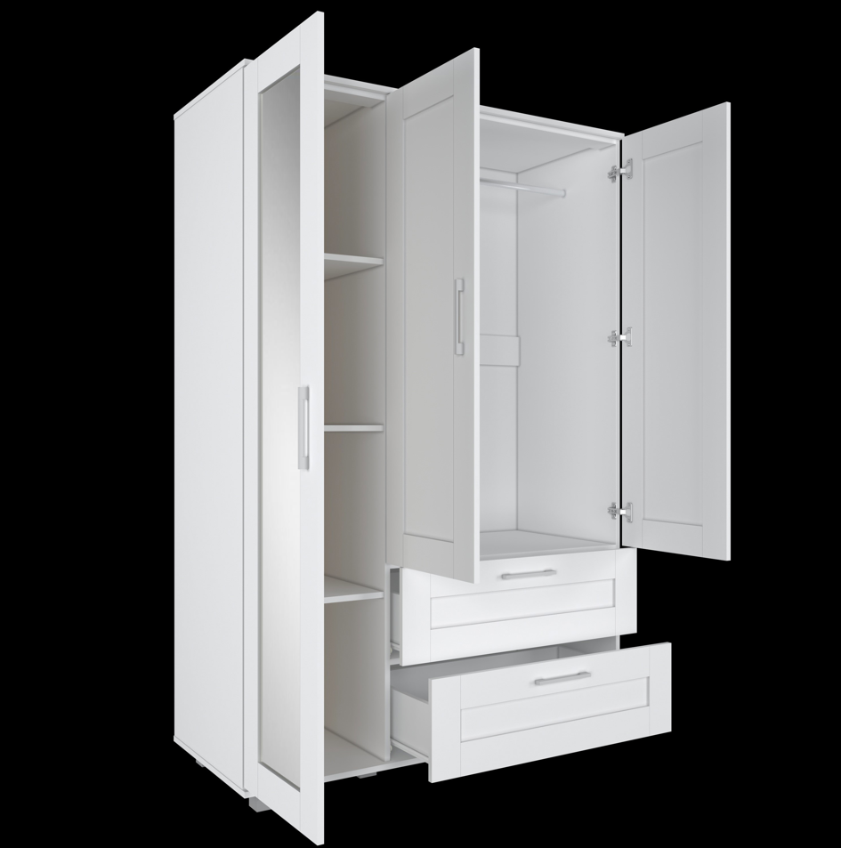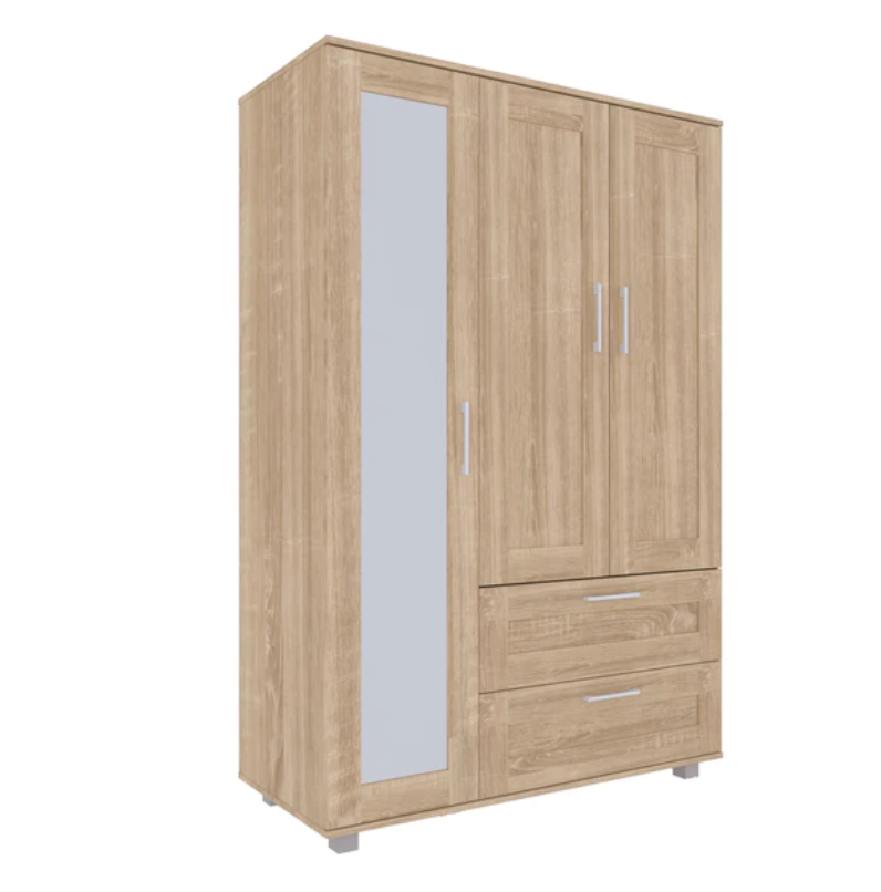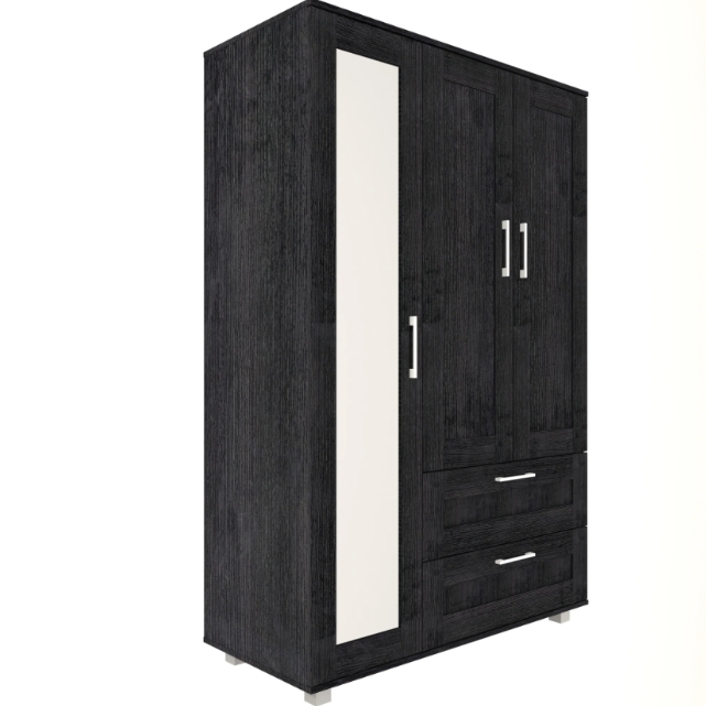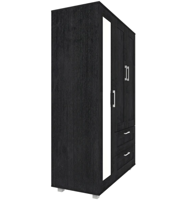 2 door wardrobe with a clothes hanging bar in the main compartment, a smaller storage compartment with 4 shelves and 2 drawers (on metal runners) - and a mirror.