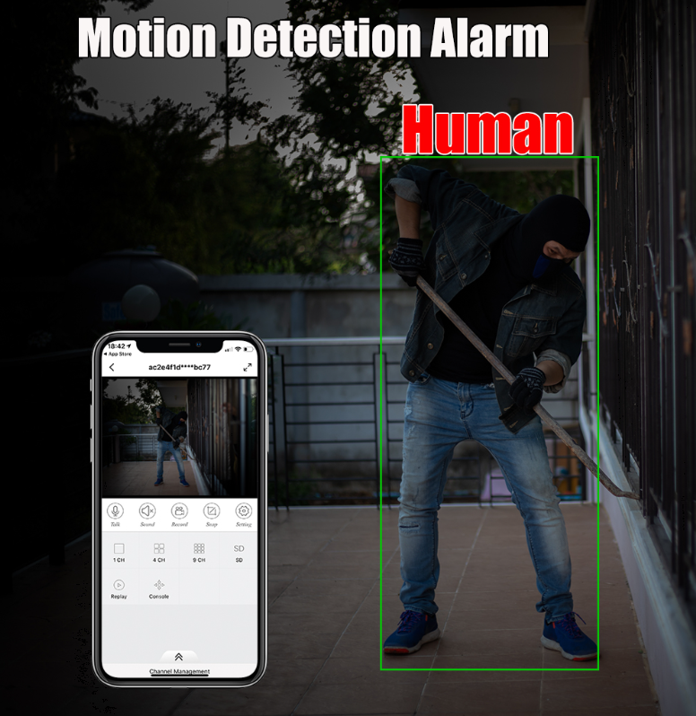 When someone breaks into shooting area, the camera will make alarm sound and alarm messages will be pushed to your Phone APP.