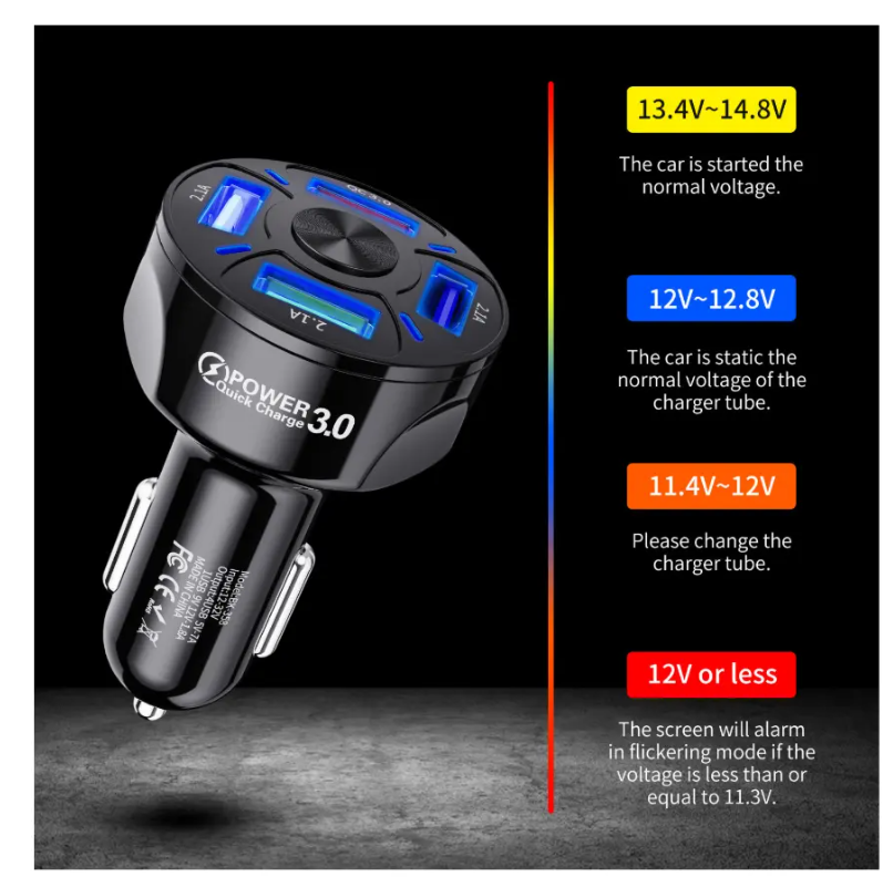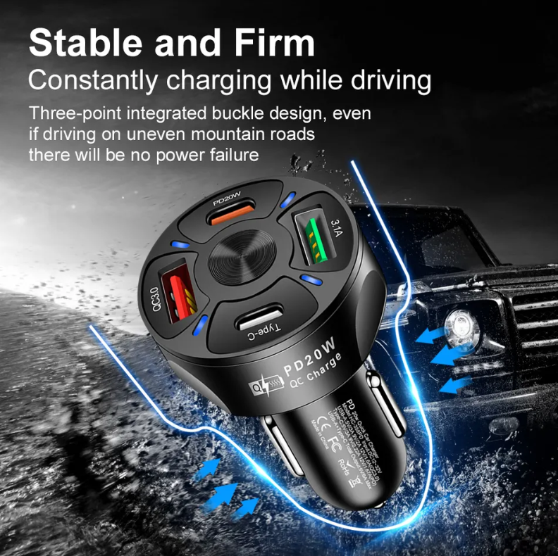 • 4-port QC3.0 fast charging: The car charger can charge at QC3.0 speed while QC3.0/3.1A/PD20W/Type-c ports can charge 4 devices,The upgraded version of the 4-port car charger has different interfaces to meet the needs of your different mobile phone charging ports.so you no longer worry about your partner not being able to charge while driving. The car charger goes well with your car. It is portable and you can take it with you.