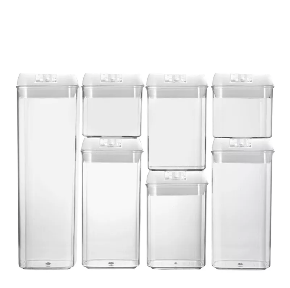 - Airtight Design & Efficient Combination 7-in-1: Once the clip on the lid is pushed down, the silicone seal inside the lid will draw the air for keeping the food dry & fresh by preventing food from the moisture and bacteria. Great for spaghetti, flour, sugar, brown sugar, rice, biscuits, pasta. 1 tall container (1.9L), 1 medium container (1.2L), 3 small containers (0.8L), 2 mini containers(0.5L).