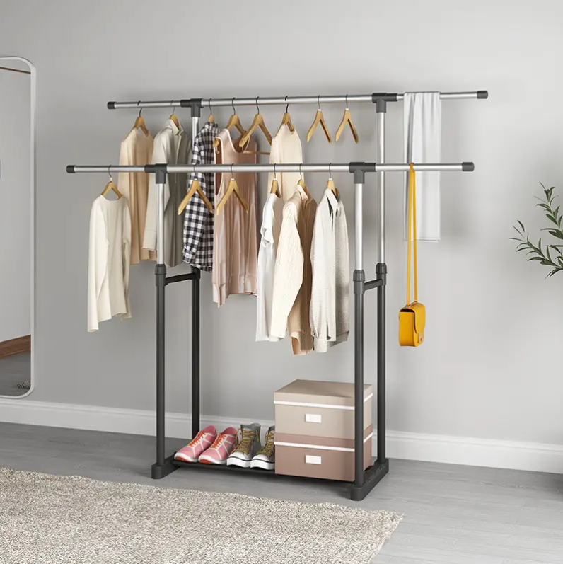 • 2-in-1 Design with Large Space:Double rod clothes rack can be placed on a high or low crossbar depending on the length of the garment. Bottom shelf gives the clothing rack supper sturdy, also provides off-the-floor space for shoes, boots, baskets and bags