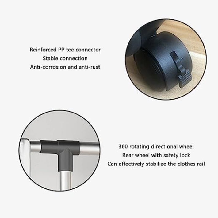• Portable And Lockable Clothes Rack:The wheels that come with the garment rack enables for easy portability to different rooms and closets in the home, office, living room, entryway, bathroom, mudroom, kid’s room, showroom