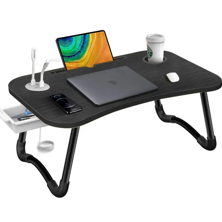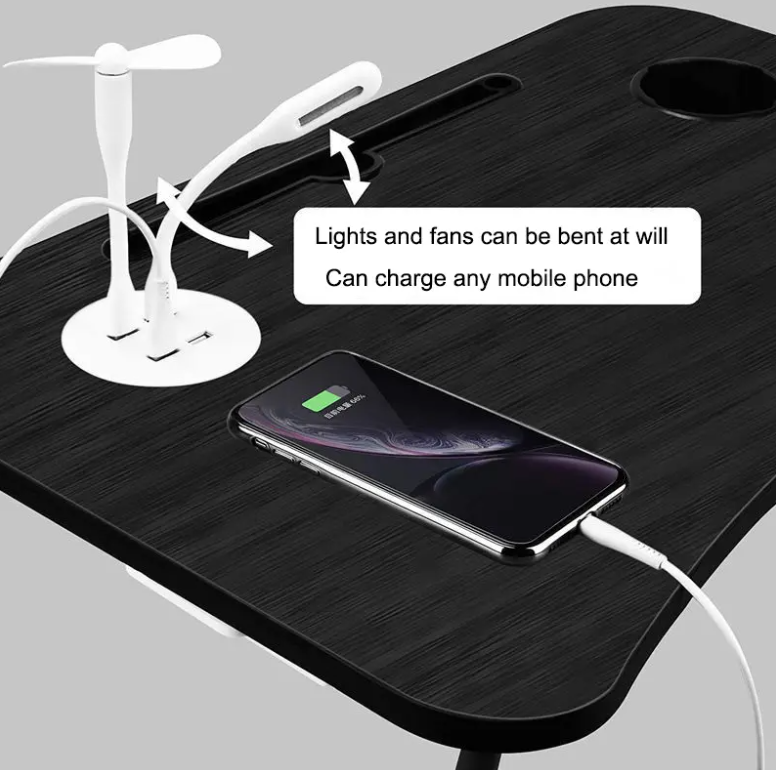 - Foldable Laptop Desk with USB Function:The foldable table legs make this foldable laptop table very portable and easy to store.You can take it anywhere. The table came with a USB powered mini light and a USB powered fan. 4 USB ports are powered by a long USB cable, you can use it to charge the mobile phone or lamp while in bed.