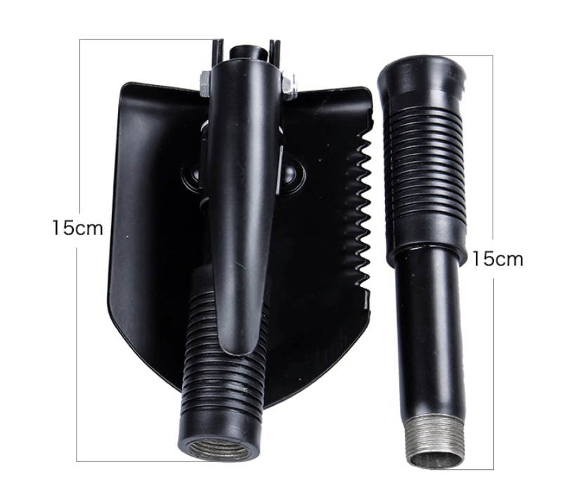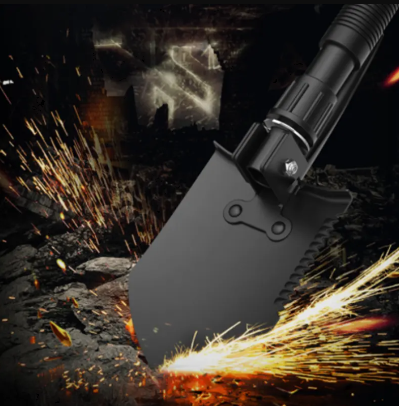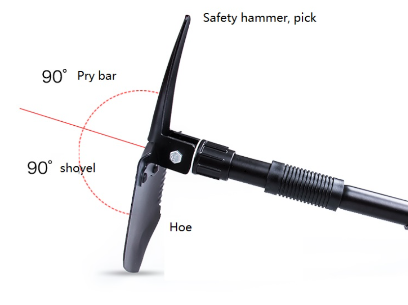 Multifunctional Foldable Shovel: Digging, sawing, cutting, hammering, shoveling. Can be used straight or at a 90 angle as a shovel, hoe, pick or saw etc.
