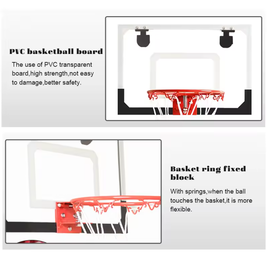 - The basketball hoop set features a heavy-duty steel rim, a shatterproof backboard and a strong ball net. The backboard has thick shockproof sponge strips to reduce noise and scratches on the door.