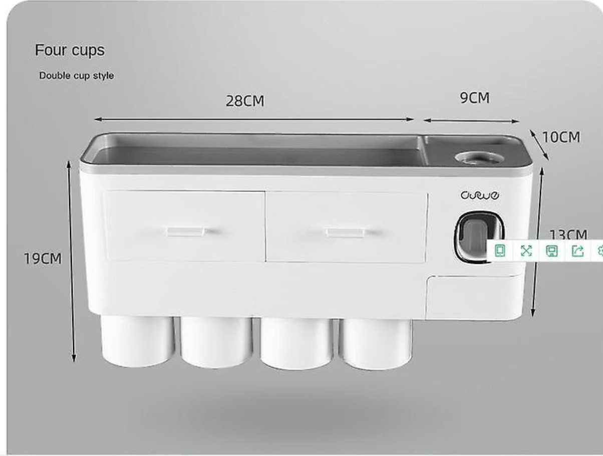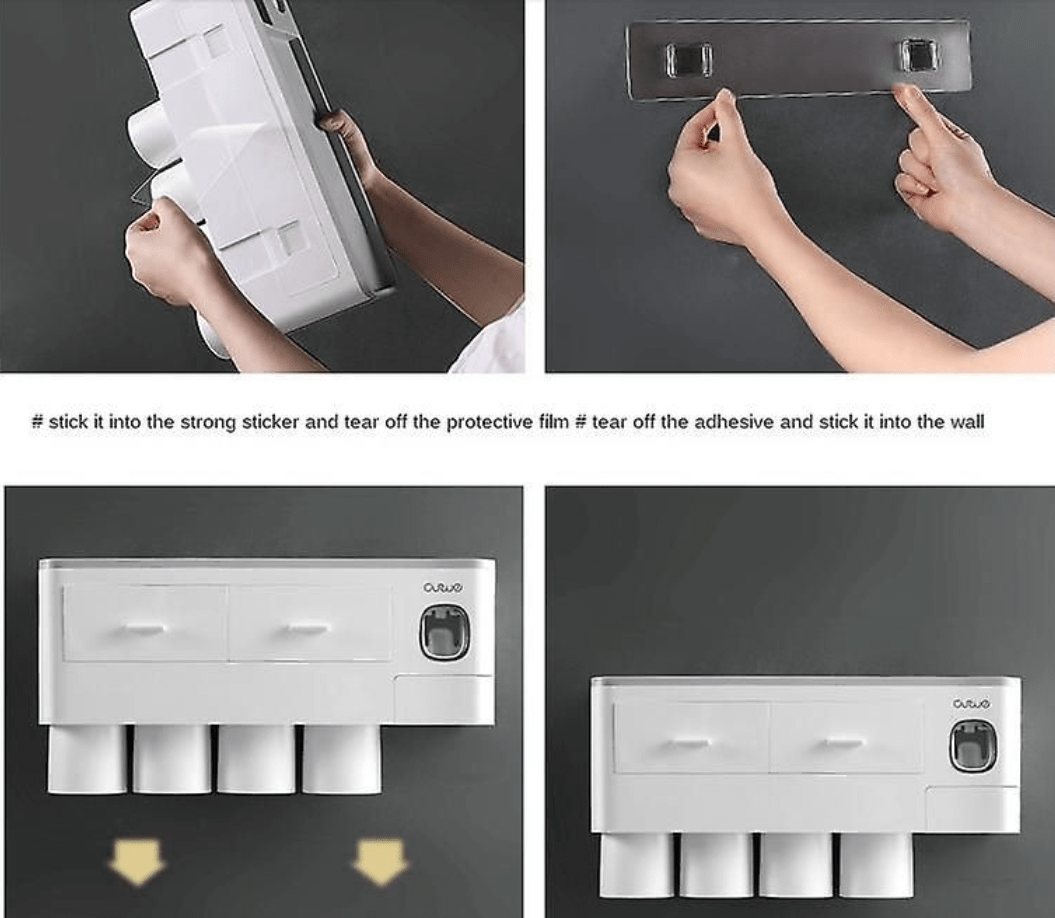 BATHROOM STORAGE BOX: Upgraded Design toothbrush Holder with 1 automatic toothpaste dispenser, one cosmetic drawer, and 4 cups. The toothbrush holder kit is made of high-quality ABS plastic. Its sleek outlook is just showing off high taste.
